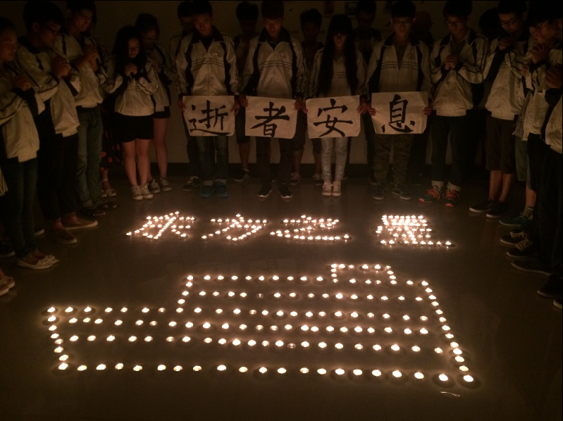 在活动现场,同学们用白色蜡烛在地面上摆出了“东方之星”的字样,在字体的下方是一个用蜡烛摆成的轮船图样。当室内的灯熄灭以后,只有那些蜡烛释放着光亮,全场一片静默,在场的同学围在点燃的烛火周围,抱拳低头默哀着。