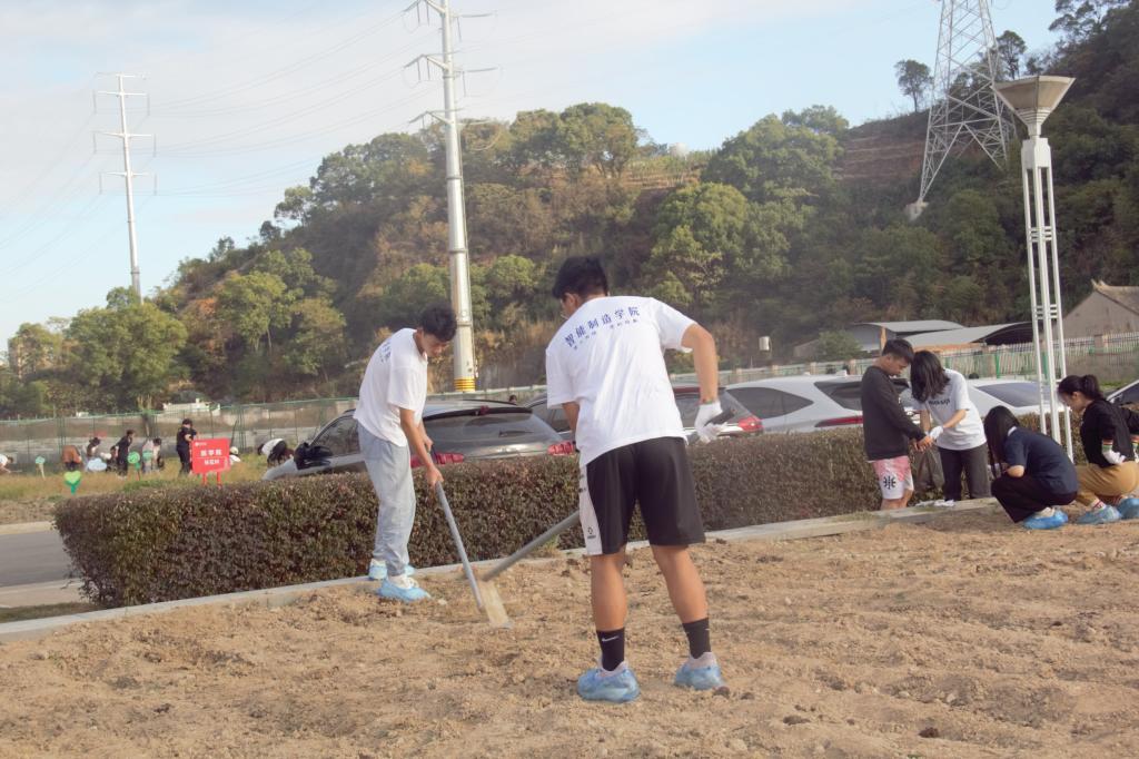 一个月前,智造学子们已经在这干裂的土地上播撒下了希望的种子,如今大多已破土而出。垦荒开始,来自智造团学会的志愿者们各司其职,部分手提着垃圾袋,仔细的搜寻垃圾与影响土质的石子,并将它们拾进垃圾袋中;部分手持小锄头,在整齐的新芽间寻找杂草的踪迹并将其清理;还有的同学手持着种子,在已经开垦过的土地间找寻空隙,重新翻土,播种,弥补未发芽种子的遗憾,留下新的希望。时光流逝,同学们沉浸在充满成就感的汗水中,相拥欢笑。告别在渐渐消逝在地平线的太阳,彰显着志愿者们的自信自强、踔厉奋发。