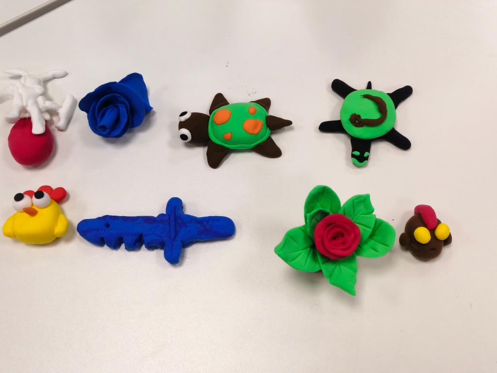 接着,粘土手工环节,每位同学获得了一份超轻粘土材料。大家以小组为单位,通过分工合作或独立完成的方式制作作品。同学们对粘土手工热情高涨,部分同学还查阅网络资料,参考手工教程完成作品。八个小组制作了各式各样的粘土玩偶,并分别分享了制作体会。