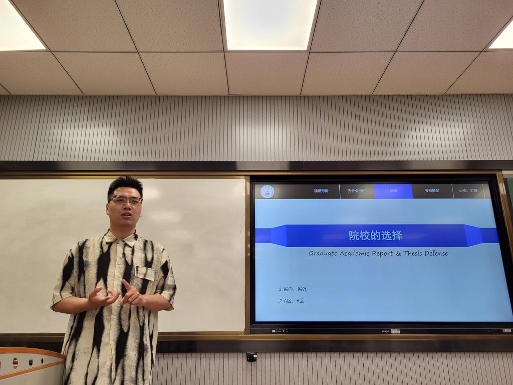 活动中,张明亮结合往年报考情况及学生所学的专业分析了2024年考研形势及目前我国不同地区、不同院校相应的招考政策,帮助同学们掌握了考研择校、择专业的方法,并对同学们在考研择校过程中遇到的问题逐一进行了指导。随后,洪诗佳、蒋凯龙结合自身考研经历,与同学们分享了备考过程中的心路历程及经验方法,并鼓励同学们努力备考,一战成硕。