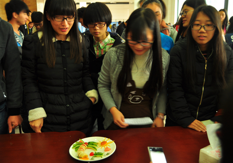 此次水果拼盘大赛分为30分钟的现场制作和6分钟解说两个环节,以寝室为单位参赛。参赛寝室成员分工明确,按各自设计理念给各种水果以华丽蜕变,作品各具特色、创意无限。苹果、西瓜、火龙果等新鲜水果成了造型新颖、美观别致的拼盘,变身成为一幅幅动人的图画,令人赏心悦目。