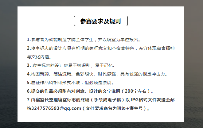 为进一步丰富和繁荣宿舍文化生活,展现各寝室的风采特色,增强凝聚力和集体荣誉感,激励同学们积极向上的精神风貌,倡导与时俱进的人文气息,智造公寓自律委员会特举办寝室标志设计大赛。