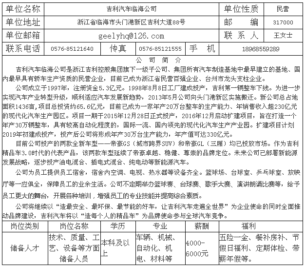 吉利集团临海公司招聘简章