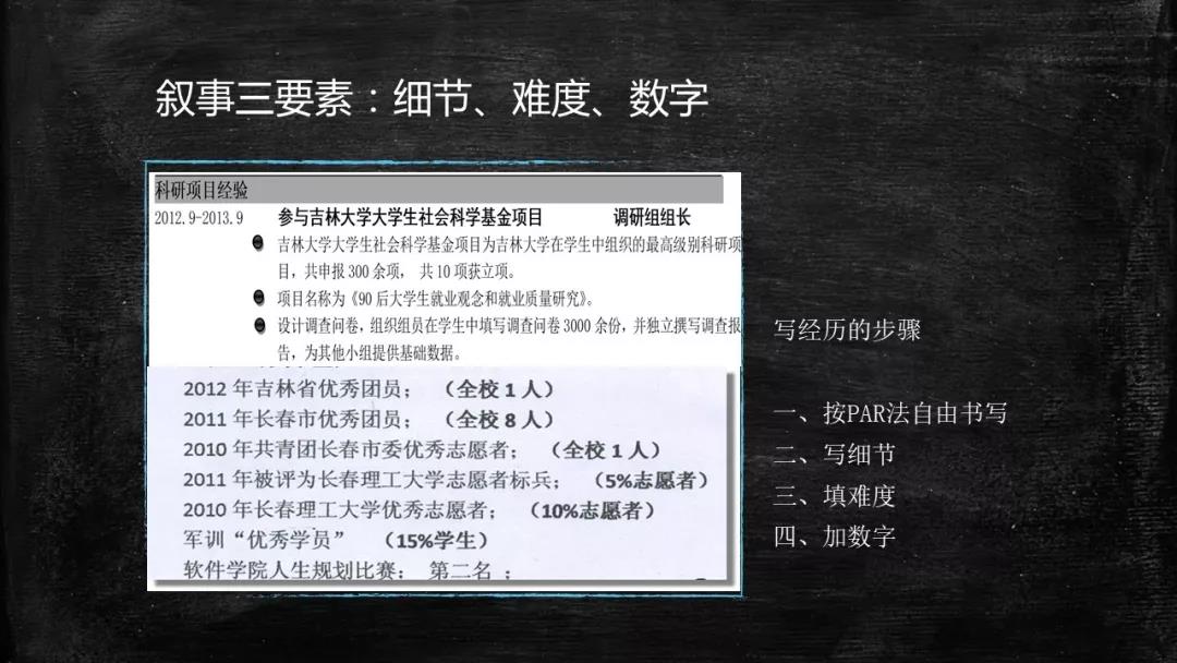 简历亮化:突出简历中的重点,与岗位职责相关的亮眼内容进行重点放大,而对于其他并不重要的部分,可以适当的进行简化甚至略写。一段与工作内容高度契合的技能或是经历远比简单的荣誉堆叠更加重要。