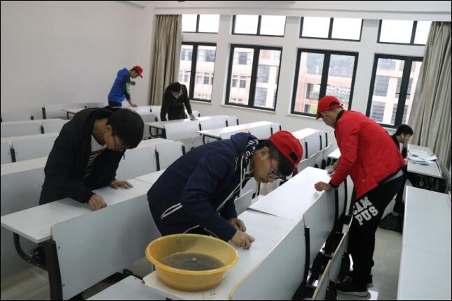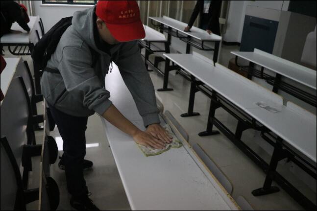 13点30分,各班负责人为志愿者们分配任务,并分发好抹布、橡皮擦、洗洁精、清洁球等清理用具。志愿者秉承为同学服务的精神,全神贯注地投入到清理行动中,不放过课桌上的每一个角落。