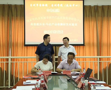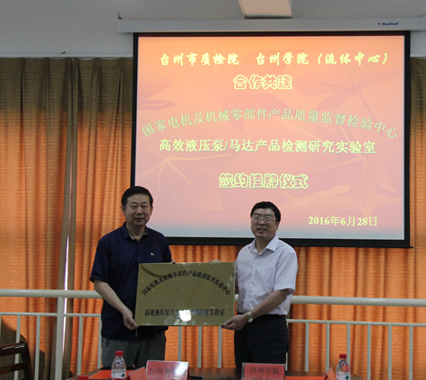 6月28日上午,太阳成tyc7111cc(流体机械及装备协同创新中心)与台州市质量技术监督研究院合作共建“国家电机及机械零部件产品质量监督检验中心——高效液压泵/马达产品检测研究实验室”签约挂牌仪式在机械工程学院会议室举行。副校长、流体机械及装备协同创新中心主任赵小明,市质检院院长潘良法出席并为共建实验室揭牌。机械工程学院院长、流体机械及装备协同创新中心常务副主任张永炬主持仪式。