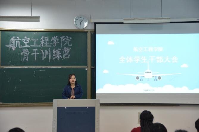 12月5日晚,航空工程学院学生干部大会暨骨干训练营开营仪式在椒江校区2-205教室召开。出席仪式的有学院党总支委员董立达以及各年级辅导员。潘林老师带领学生干部学习了《学生会、研究生会干部自律公约》,并就骨干训练营的活动安排、人员选拔等进行了介绍。据悉,骨干训练营包含“博智”、“提能”、“广行”及“至善”四大工程,包含理论学习、能力锻炼、实践交流和素质拓展等版块,以学年为培训周期,参训学员考核合格颁发结业证书。