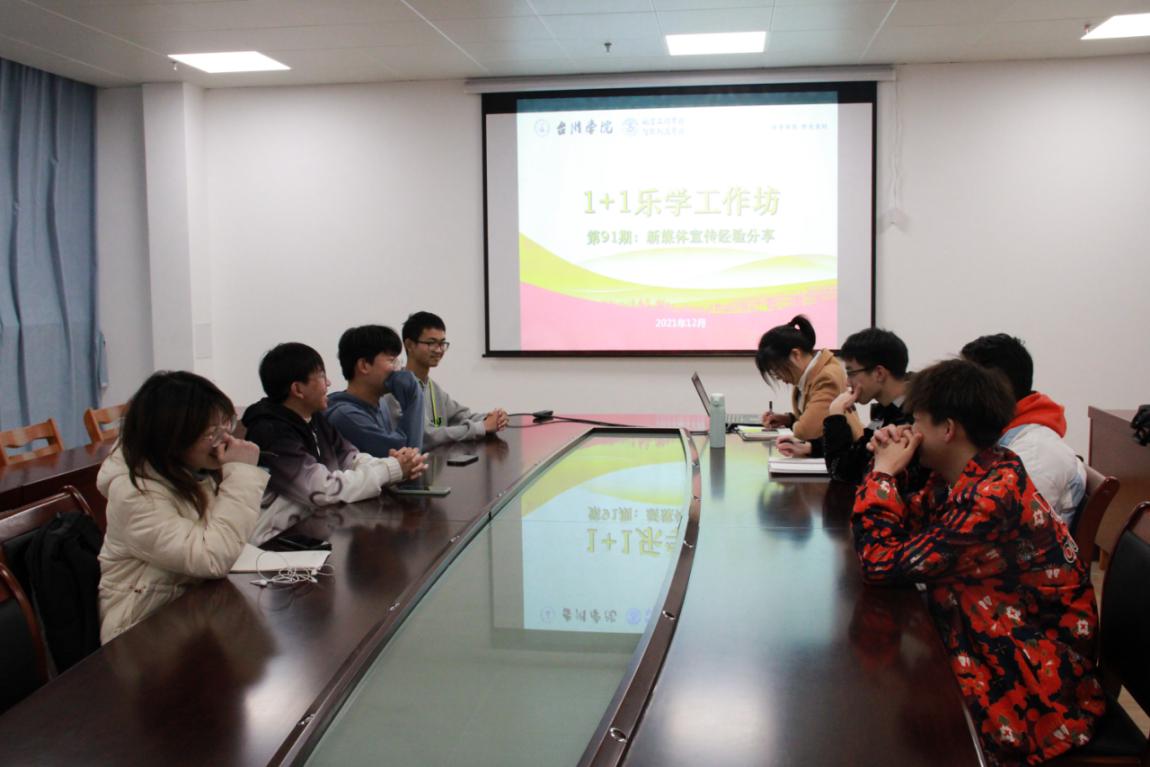 2021年12月1日傍晚,航空工程学院(太阳成tyc7111cc)在航空楼S501教室举行以“新媒体宣传经验分享”为主题的“1+1乐学工作坊”活动。学院辅导员王越担任活动导师,航空团学会宣传部成员参加。