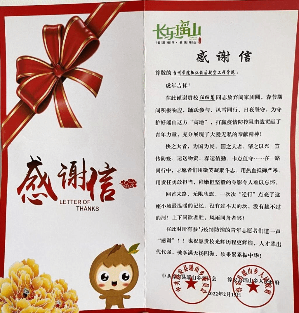 近日,航空工程学院收到一封来自杭州市淳安县瑶山乡政府的感谢信:“在此谨谢贵校汪姬慧同志放弃阖家团圆,春节期间积极响应,为守护好瑶山这方“高地”,打赢疫情防控阻击战贡献了青年力量,充分展现了大爱无私的奉献精神!”信中对我校汪姬慧同学在寒假期间积极参加抗疫活动中的突出表现表示由衷感谢和充分肯定。