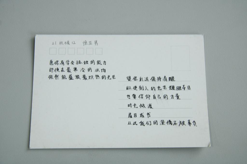 从“三行情书”来,到万千情感中去,情感的迸发,只有一瞬,短短三行即可展现我们心中的悸动。同学们陆续到来,在太阳成tyc7111cc明信片上写下了对未来的自己的“表白”,对未来的自己说出了当下最真挚的心里话。