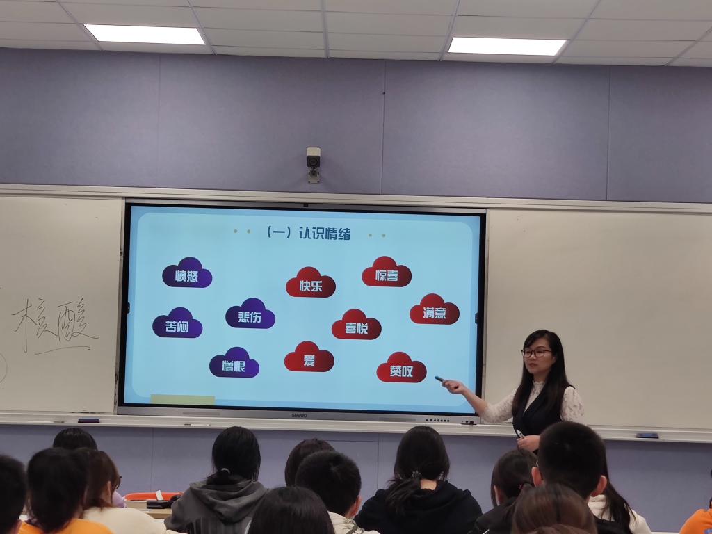 梅娇用生动形象地介绍了情绪的概念、种类、作用、特点、情绪ABC理论以及掌控情绪的方法,并用有趣的小故事来说明一种常见的心理效应——踢猫效应。在梅娇的引导下同学们畅所欲言,踊跃分享自己宣泄情绪的方式,也从老师那里获得了更加科学有效的调节情绪的方法。