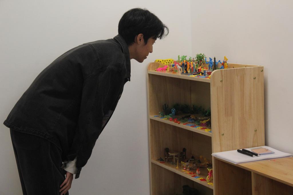 活动开始,梅娇介绍了沙盘活动的规则,引导同学们从置物架上挑选心仪的沙具放入沙盘。经历了十轮游戏,通过非语言沟通,沙盘逐渐成型,变成一个有人物、海滩、森林、动物的小岛。沙盘摆放结束后,梅娇陪伴参与者对沙盘世界进行探索,询问各个物品摆放的原因,了解参与者行动背后的动机。最后,梅娇引导每位参与者从沙盘上撤走一样沙具,并对协作完成的沙盘作品进行打分。
