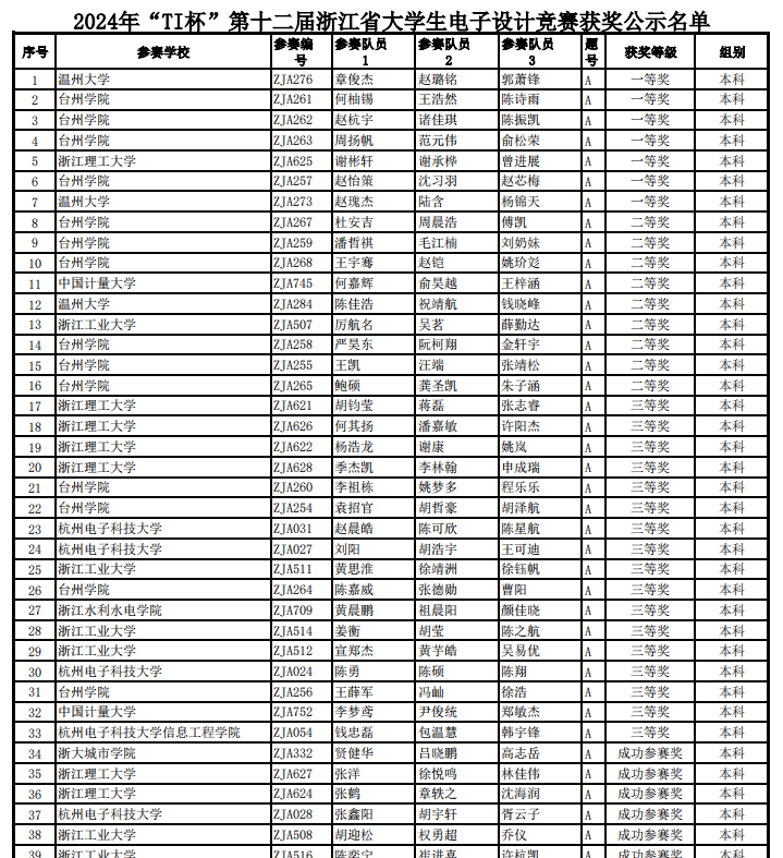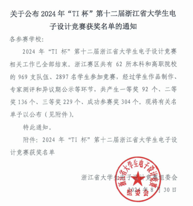 8月30日,2024年“TI杯”第十二届浙江省大学生电子设计竞赛获奖名单发文公布,在暑期进行的该项赛事,我校电气工程及其自动化专业学生报名参赛18组(54人),共获得省三等奖以上15项。其中参赛选题方向为电力电子技术(A题)的16组,获得全省该方向上7个一等奖中的4个,9个二等奖中的6个,以及4个三等奖,成绩名列该方向全省第一。电力电子技术方向赛题紧扣产业前沿技术或产品应用,难度较高,参加该赛题可以让学生及时了解产业需求,锻炼学生解决复杂工程能力,以及系统创新设计能力。