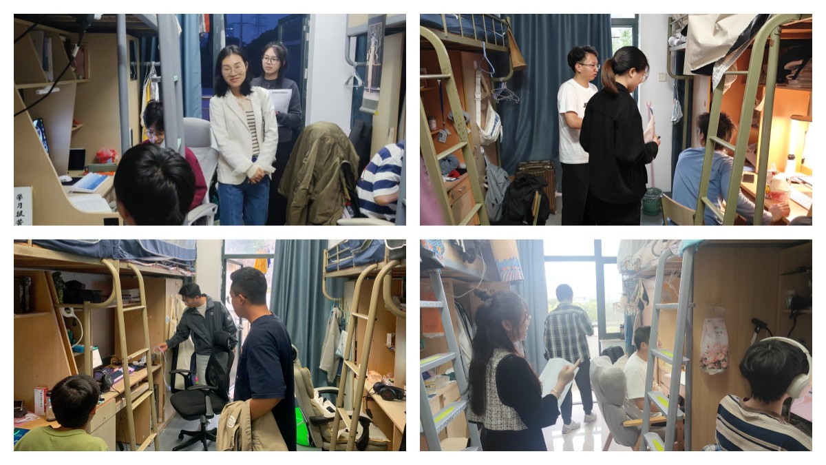随后,各位参加检查的辅导员老师带领学生干部分头深入到学生宿舍,按要求对学生宿舍进行检查,对发现的问题逐一进行了登记,并提出整改意见。大家重点排查学生宿舍是否存在违规使用大功率电器、明火、私拉电线等安全隐患,部分寝室查收的违规电器由宿管阿姨进行统一保管;在检查学生宿舍的卫生整洁情况时,对于物品摆放杂乱、床头悬挂衣物以及厕所卫生等问题,当场指出并提出限时整改意见,由寝室长负责督促落实,引导同学们养成良好的学习生活习惯。在检查过程中,辅导员老师与学生进行交流了解学生思想动态,也进一步排查是否有同学夜不归宿、违规外宿等情况。