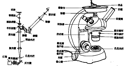 孔径光栏和视场光栏:孔径光栏装在照明反射镜座上面,调整孔径光栏能够控制入射光束的粗细,以保证物像达到清晰的程度。视场光栏设在物镜支架下面,其作用是控制视场范围,使目镜中视场明亮而无阴影。