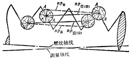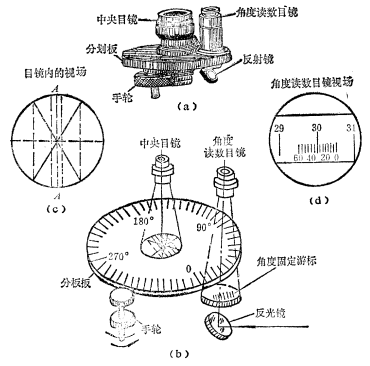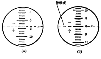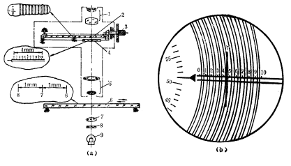 这样就可以达到细分读数的目的。这种仪器的读数方法如下:从目镜中观察,可同时看到三种刻线(图3b),先读毫米数(7mm),然后按毫米刻线在固定分划板4上的位置读出零点几毫米数(0.4mm)再转动手轮3,使靠近零点几毫米刻度值的一圈平面螺旋双刻线夹住毫米刻线,再从指示线对准的圆周刻度上读得微米数(0.051mm)。