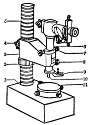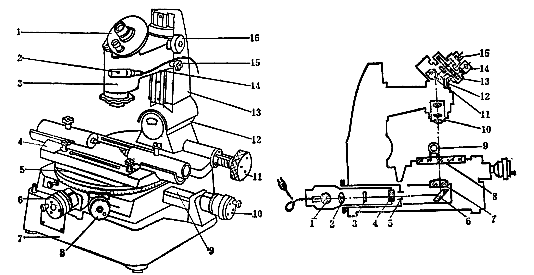(5)移动尾管10(11是尾管的微调螺钉),同时转动工作台横向移动手轮7,使测钩的内测头在标准环端面上刻有标线的直线方向或量块组的侧块上接触,用紧固螺钉13锁紧尾管;然后用手扶稳测量轴3,挂上重锤,并使测量轴上的测钩内测头缓慢地与标准环或侧块接触。