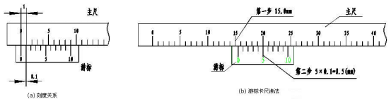 式中 ΔL标 表示主尺分度值与游标尺分度值之差,称为游标尺的最小分度值。以10分度的游标卡尺为例:图2(a)表示了游标与主尺的刻度关系,游标尺上每一分格比主尺的最小分格短0.1mm。所以,该游标尺的最小分度值为0.1mm。图2(b)表示了该游标尺的读数方法。
