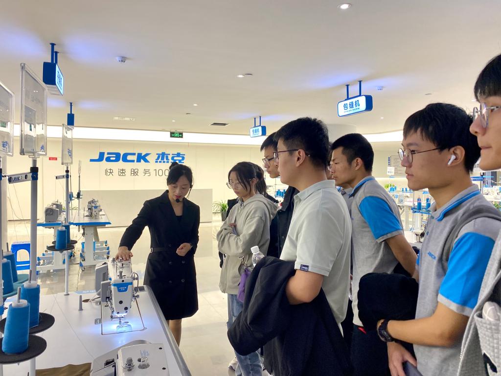 师生一行人还来到位于临海市的杰克子公司拓卡奔马厂区,工作人员带领师生参观了工业缝纫机展厅,观摩了裁床试裁,近距离接触了新型智能缝纫机。